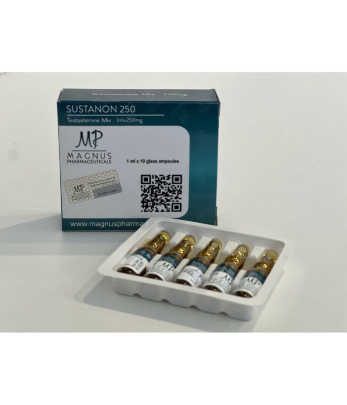 Купить Сустанон Sustanon 250 5 amp 250mg/1ml Magnus PharmaceuticalsСустанон – композитный стероид, содержащий одновременно несколько активных компонентов. Всего их четыре, а представляют собой они эфиры Тестостерона. При этом каждый активный компонент суста имеет определенный период полураспада. Благодаря этому они вступают в работу постепенно, что позволяет стероиду начинать воздействовать на организм сразу после введения. В то же время Сустанон является пролонгированным анаболиком. Мы рекомендуем купить Sustanon для проведения мощных массонаборных курсов.Эффекты Sustanon магнус Среди большого количества положительных качеств этого анаболика стоит выделить несколько:позволяет быстро набирать массу;увеличивает силовой потенциал;положительно влияет на работу суставно-связочного аппарата;ускоряет регенеративные процессы, благодаря чему атлеты могут быстрее восстановиться после тяжелого тренинга;усиливает аппетит;повышает сексуальное влечение.Если вы хотите заказать Sustanon на выгодных условиях, то обращайтесь в наш магазин.Соло курс Sustanon магнус Рекомендуемая недельная дозировка Сустанона составляет 250-750 мг. Учитывая большой период полужизни препарата, в течение семи суток вы можете делать максимум 2 укола. Длительность курсов с участием суста составляет 8-12 недель.Комбинирование препаратаВсе тестостерон содержащие анаболики отлично сочетаются с любыми ААС. Сустанон не является исключением из этого правила. Так как это отличный препарат для набора массы, то логично использовать его с соответствующими анаболиками. В первую очередь речь идет о длинных Тренболонах, Оксиметолоне, Болденоне, Метандиеноне, Деке. Грамотное использование этих сочетаний позволит вам набрать большое количество мышечной массы.ПКТ после курса Sustanon Магнус Сустанон – сильный стероид, склонный к ароматизации. Таким образом, после его отмены ПКТ должна быть проведена в обязательном порядке. Стартовать она должна через две недели с момента последней инъекции. В течение 4 недель используйте ежесуточно по 20 мг тамокса либо по 50 мг Кломида. Также можно ввести в состав восстановительной терапии тестсотероновые бустеры.Цена Сустанон Магнус Цена Sustanon в нашем магазине понравится многим атлетам. Заказать этот анаболик могут жители любого города Украины: Львова, Полтавы, Харькова, Донецка и т.д. Мы доставим ваш заказ в максимально короткие сроки.