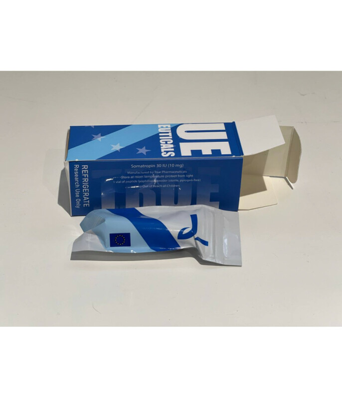 Купить гормон роста Somatropin True Pharmaceuticals Somatropin True Pharmaceuticals — сильнодействующий метаболический гормон роста для спортсменов. Основная функция препарата — высокая продуктивность в процессе метаболизма липидов, белков и углеводов, за счет чего возрастает выдержка, тренировки дают высокий профит. В продажу препарат поступает в виде раствора в 10 мл флаконе, что эквивалентно 30 МЕ. Активные вещества, которые используются для приготовления раствора, имеют белый оттенок. При растворении соматропина должны отсутствовать механические включения и различные добавки, чтобы добиться максимального эффекта воздействия.Механизм действия и свойства Somatropin True Pharmaceuticals Somatropin продуцируется в клетках Escherichia coli. Тяжелоатлетам и спортсменам с разной степенью нагрузки рекомбинантный гормон роста помогает в разы быстрее развить скелетные мышц, способствует скоплению необходимых жиров в них. К Somatropin особенно чувствительна висцеральная жировая тканевая прослойка. К основным задачам соматропина относятся:ускоренный набор мышечной массы;сжигание лишнего жира;повышение мотивации к тренировкам;омоложение кожи и эффект ее подтяжки;улучшение качества сна;усиление эффекта анаболиков.Особой популярностью пользуется рекомбинантный гормон у женщин спортсменок, благодаря способности препарата поддерживать кожу в тонусе, высокой эффективности в борьбе с целлюлитом, обеспечению сжигания нежелательного жира. Также препарат имеет следующие функциональные особенности.Обмен липидовНаблюдается стимуляция рецепторов холестерина в печени, а также улучшение общего состояния этих элементов и липопротеинов в сыворотке кровеносной системы. При применении соматропина отмечается стабилизация общих показателей холестерина.Обмен углеводовSomatropin отвечает за повышение уровня инсулина. При этом значение глюкозы в кровеносной системе зачастую остается неизменным.Водно-солевая секрецияНедостаток гормонального элемента нередко встречается среди спортсменов, что негативно влияет на получение результатов даже от усиленных тренировок. Также его нехваткой очень часто объясняется ухудшение состояния и количества плазмы крови, жидкостей в тканях. Но после применения средства Somatropin True Pharmaceuticals наблюдается улучшение этих показателей. Благодаря ему, в человеческом организме задерживаются такие важные элементы, как калий, фосфор и натрий.Регенерация в костях и сила в мышцахПрепарат позволяет улучшить процессы обновления тканей в костях скелета. В результате чего можно заметить улучшение минерального состава костей и их плотности, особенно в тех местах, где они являются опорными. Также применение препарата на протяжении длительного времени позволяет увеличить силы в мышцах, способность выдерживать физические нагрузки. Это, в свою очередь, позволяет давать на тело большую нагрузку, без риска получить травму скелета или мышц.Как принимать гормон ростаЧтобы достичь эффекта, достаточно использовать минимальную суточную дозу 4-5 МЕ. Такую дозировку можно вводить инъекционно несколько раз. Важно учитывать природу гормона роста — его пик выработки организмом отмечается в ночное время. По этой причине оптимально принимать препарат перед ужином или сном.Как колоть гормон ростаИнъекции делают в живот, бедро или руку. Выбирая для укола место на животе, отступите